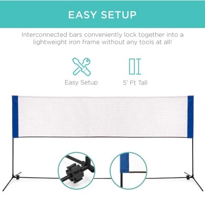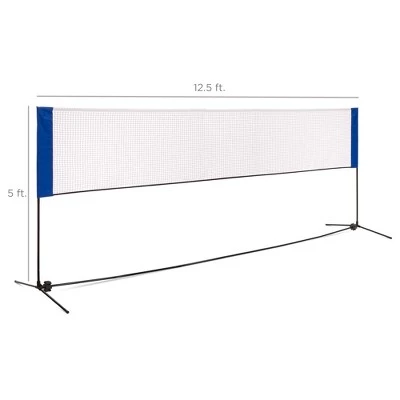 Let the games begin! This 12.5ft Freestanding net is compact and perfect for indoor or outdoor games of badminton, volleyball, and tennis. With a little creativity, the net can even be serviceable for a round of soccer or pickleball! This 5ft-tall net features an easy setup for the eager gamer. Interconnected bars conveniently lock together into a lightweight iron frame without any tools at all! The frame and net fold down for quick and easy storage in the included carrying bag. Light & sturdy, the durable metal poles resist warping while PVC joints lock the frame in place! Please note: It is recommended you add weights for stability. With just a little creativity and a few additions, this is the net for all occasions!