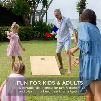 Enjoy a round of cornhole with the kids, or uncover the other 5 holes and play a round of beer pong with your friends! This portable set is great for family gatherings and trips to the beach, park, or tailgating and comes with a premium coating for weather-resistant quality. Fit both gameboards into one backpack-style carrying bag and store the accessories in another. (Please note: the accessory bag can accommodate the play pieces and hole covers.) 100% premium-coated wood with slanted legs prevents wear over time. This game assembles easily and includes two sets of bean bags and hole covers for varied play. Children and adults will get a kick out of this fresh classic! Product Specifications: Game Board Dimensions: 25in x 37in, Game Board Cover: 25in x 37in, Accessory Bag: 19in x 12in