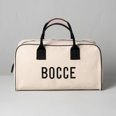 Spend a little extra time outdoors with the Bocce Ball Lawn Game Set from Hearth & Hand™ with Magnolia. This bocce ball game set features four pairs of bocce balls in red, yellow, blue and light blue hues to you can have up to four players or teams in your game. It also comes with a small white pallino that acts as your target for the game. You can conveniently carry the set around on a clean canvas tote bag that says “Bocce” in black lettering. Whether you’re out camping or having some fun in the front yard, this bocce ball set makes a fun activity.