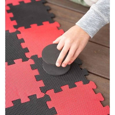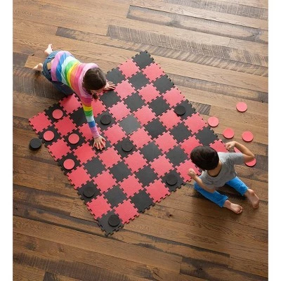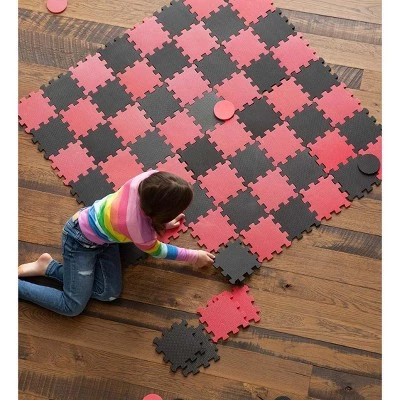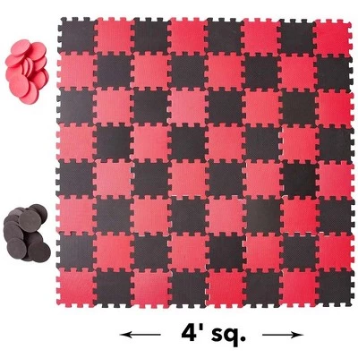- Includes 64 interlocking red and black square foam pieces (¼” thick) that fit together to form a 4′ sq. checkerboard. Can also be used as a soft play mat for little ones