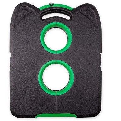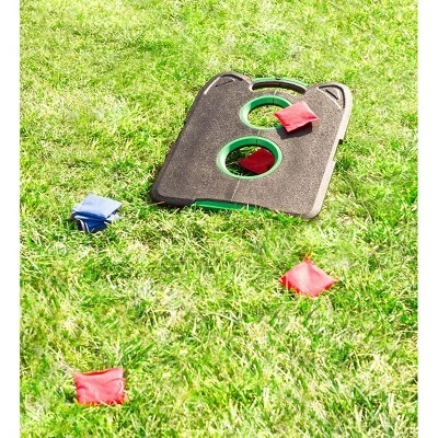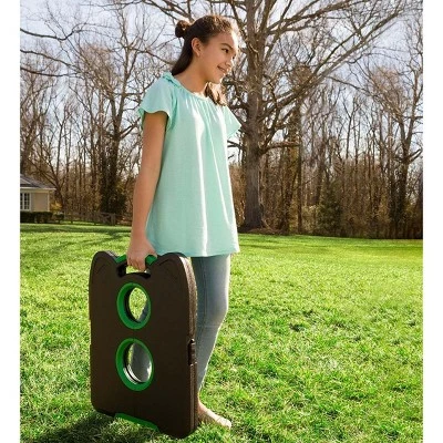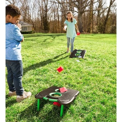 This lightweight travel set is a new spin on the classic cornhole game. With HearthSong® Pick-Up-and-Go Cornhole, you can play anywhere! Our portable boards are slightly smaller than traditional cornhole boards (23″L x 18″W x 4″H), which makes them more approachable for younger players. The boards also have two holes rather than one, offering an extra opportunity for scoring. The four legs on each board pop out for play and tuck in neatly for storage. All pieces store conveniently inside the locking boards, making this set the perfect portable party game. Set includes four blue and four red cornhole bags, and directions for play.