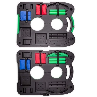 - Set includes two boards with attached scorekeeper, four red and four blue cornhole bags, and instructions