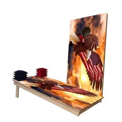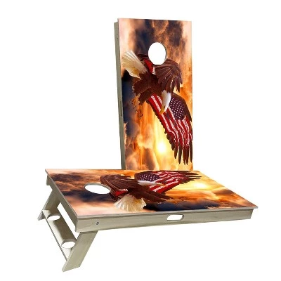 If you are looking to tailgate like a pro or spice up your next backyard party, our American Flag Bald Eagle Cornhole Boards are perfect for you. In addition to providing endless fun at home, our cornhole game sets are incredibly portable and can be taken virtually anywhere. This means you can easily bring them on your next camping trip, to the big game, to the beach, the lake, or anywhere else you want to play corn hole. You can even set them up and play in a dorm room. All of our games are easy to store, transport and setup, so you can focus on more important things, like playing! Simply take them out of the box and start enjoying them right away. This Cornhole Board Set is 100% Handmade in America and custom built for each order. You can now choose between 2 different sizes. Our Backyard 2×4 Boards are built with High Quality 5/8″ Birch and feature Pocket Hole Screw Construction. These boards are lighter and more affordable than our Professional option. Our Professional 2×4 Boards are built with the same High Quality 5/8″ Birch and Pocket Hole Screw Construction. Our Pro Boards also include Carrying Handles & Cross-Bar Support with Built-In Cup Holders. These boards are ready for Tournament Play right out of the box! All of our designs are printed with UV Resistant Inks to prevent peeling and fading. Know that you will be getting the highest quality in custom cornhole.