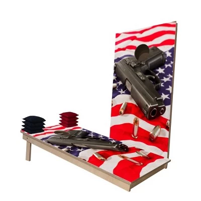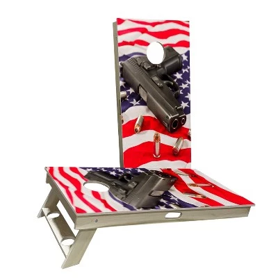 If you are looking to tailgate like a pro or spice up your next backyard party, our American Flag With Pistol Cornhole Boards are perfect for you. In addition to providing endless fun at home, our cornhole game sets are incredibly portable and can be taken virtually anywhere. This means you can easily bring them on your next camping trip, to the big game, to the beach, the lake, or anywhere else you want to play corn hole. You can even set them up and play in a dorm room. All of our games are easy to store, transport and setup, so you can focus on more important things, like playing! Simply take them out of the box and start enjoying them right away. This Cornhole Board Set is 100% Handmade in America and custom built for each order. You can now choose between 2 different sizes. Our Backyard 2×4 Boards are built with High Quality 5/8″ Birch and feature Pocket Hole Screw Construction. These boards are lighter and more affordable than our Professional option. Our Professional 2×4 Boards are built with the same High Quality 5/8″ Birch and Pocket Hole Screw Construction. Our Pro Boards also include Carrying Handles & Cross-Bar Support with Built-In Cup Holders. These boards are ready for Tournament Play right out of the box! All of our designs are printed with UV Resistant Inks to prevent peeling and fading. Know that you will be getting the highest quality in custom cornhole.
