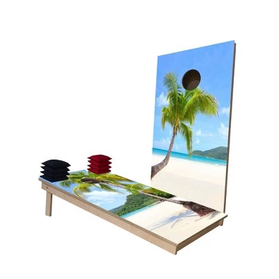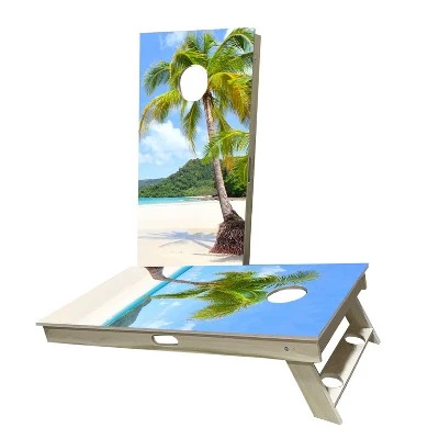 If you are looking to tailgate like a pro or spice up your next backyard party, our Beach Paradise Cornhole Boards are perfect for you. In addition to providing endless fun at home, our cornhole game sets are incredibly portable and can be taken virtually anywhere. This means you can easily bring them on your next camping trip, to the big game, to the beach, the lake, or anywhere else you want to play corn hole. You can even set them up and play in a dorm room. All of our games are easy to store, transport and setup, so you can focus on more important things, like playing! Simply take them out of the box and start enjoying them right away. This Cornhole Board Set is 100% Handmade in America and custom built for each order. You can now choose between 2 different sizes. Our Backyard 2×4 Boards are built with High Quality 5/8″ Birch and feature Pocket Hole Screw Construction. These boards are lighter and more affordable than our Professional option. Our Professional 2×4 Boards are built with the same High Quality 5/8″ Birch and Pocket Hole Screw Construction. Our Pro Boards also include Carrying Handles & Cross-Bar Support with Built-In Cup Holders. These boards are ready for Tournament Play right out of the box! All of our designs are printed with UV Resistant Inks to prevent peeling and fading. Know that you will be getting the highest quality in custom cornhole.