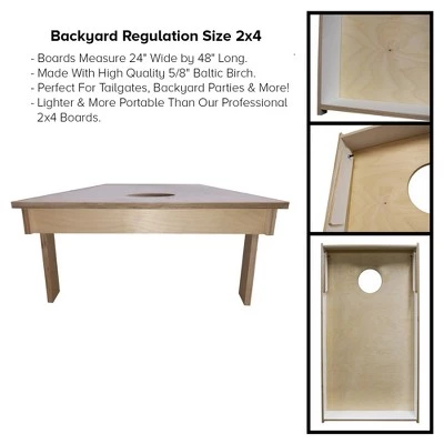 - Our Professional Regulation Size 2×4 Boards measure 24″ Wide by 48″ Long. They feature carrying handles for easy mobility and are perfect for Tailgates, Backyard Parties & More.