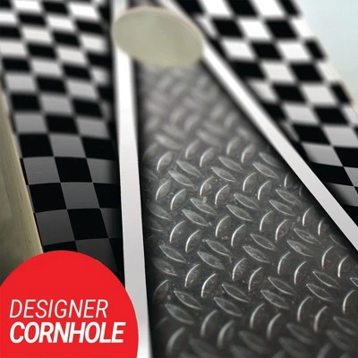 - Perfect, CNC Machine cut, regulation 6” round holes. The design is printed in digital high quality directly onto the playing surface. No more slick, peeling vinyl.