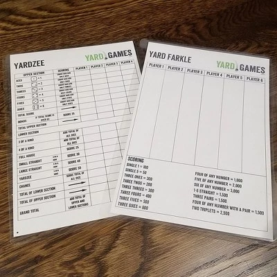 - Laminated scorecards for Yardzee and Yard Farkle are provided with additional instructions for multiple games
