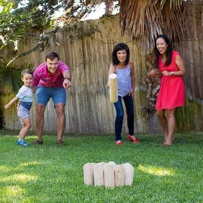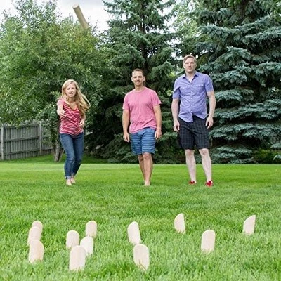 - Bundle includes YardGames Kubb Premium Wooden Game Set, YardGames Burned Hardwood Outdoor Scatter Toss Target Lawn Game Skittles Set, and YardGames Wooden Double Ladder Toss Game Set