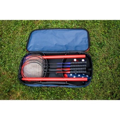 Take the Patriotic Portable Badminton Set with you anywhere and fun is sure to follow. This two to four player set is perfect for active families and is a great addition to any cook out, beach party or tailgate. No tools or stakes are required to assemble this badminton set. To assemble, simply extend the telescopic poles, attach the net and you’re ready to play. The freestanding base sets up on any surface and doubles as a lightweight carrying case. Don’t worry about buying additional accessories, this set includes four rackets (two red, two green), two shuttlecocks, net, and carrying case.